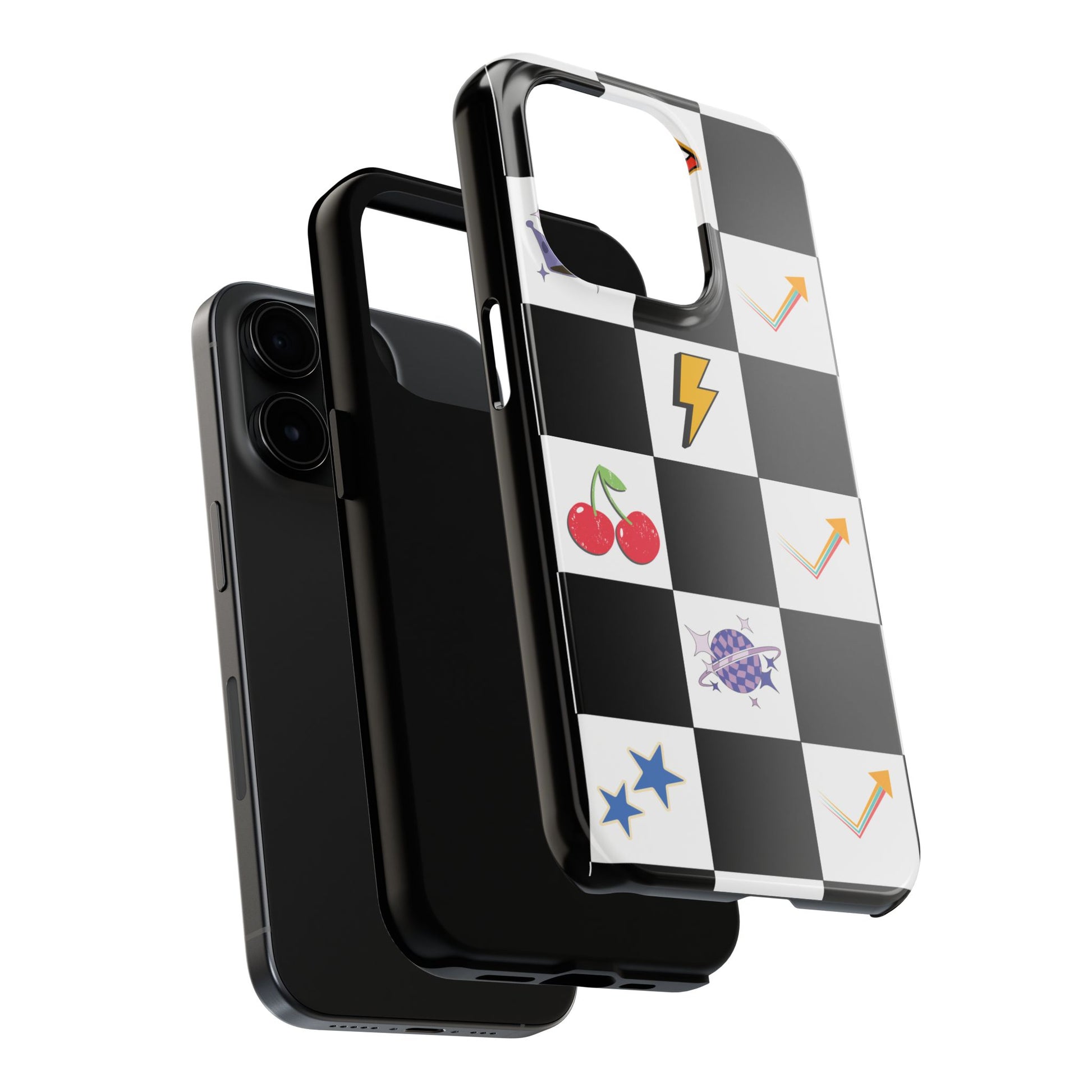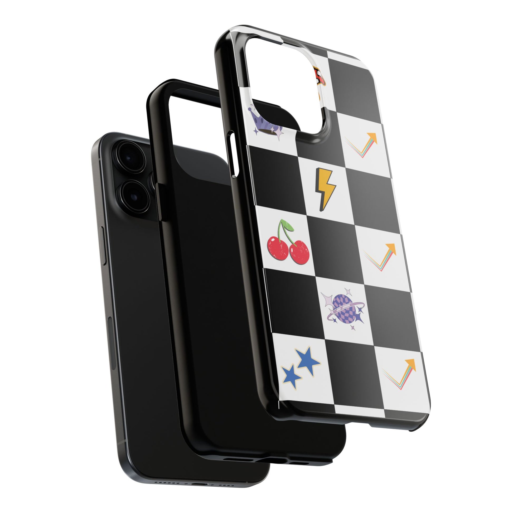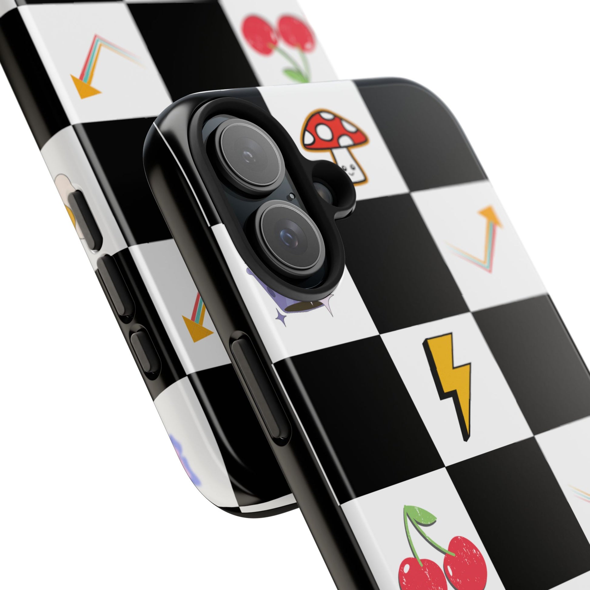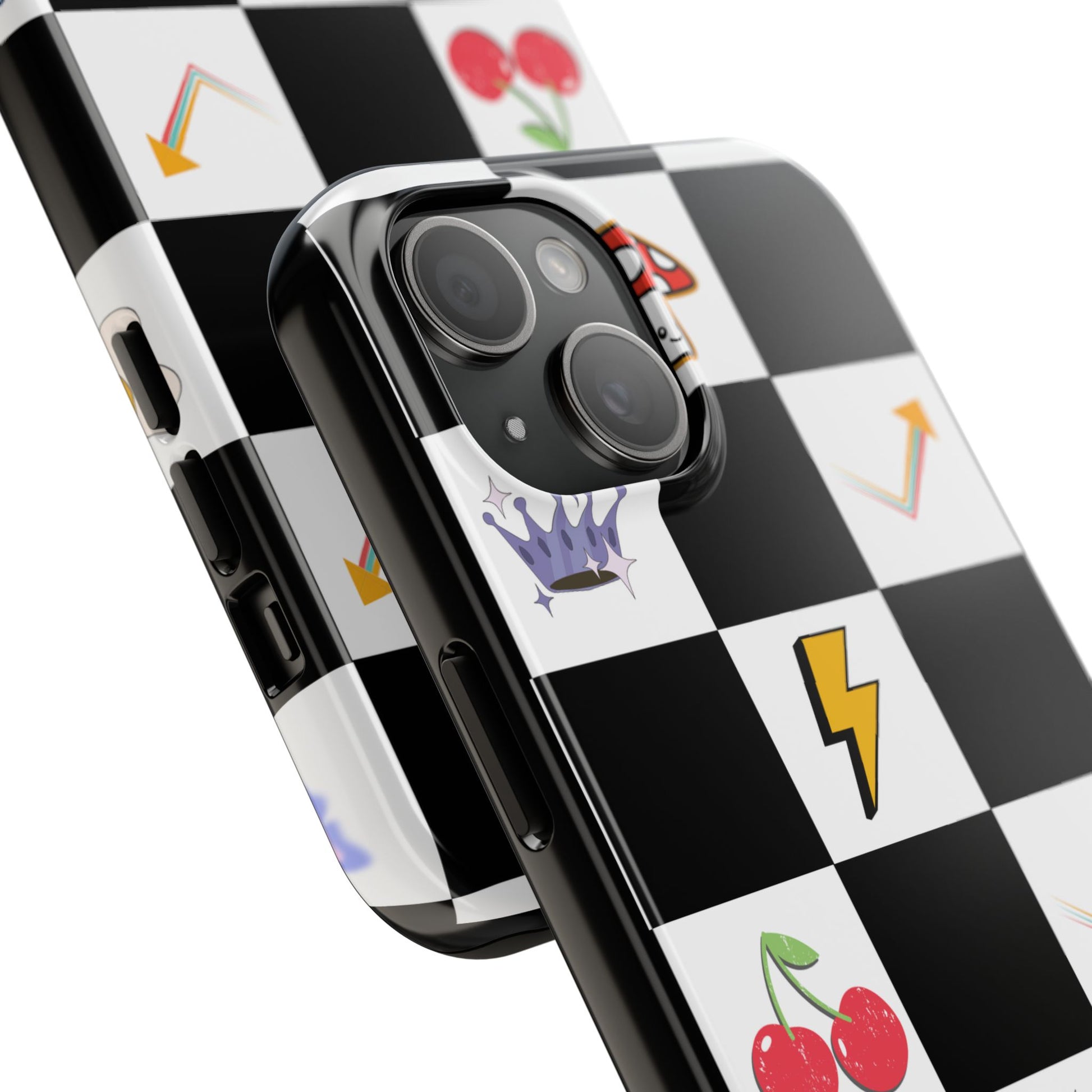 A striking, durable phone case that brings playful retro charm to everyday protection. The bold black-and-white checkerboard design is dotted with bright, whimsical icons — cherries, mushrooms, lightning bolts, stars and arrows — giving the case a lively, arcade-era vibe. Built with a tough polycarbonate shell and soft TPU liner, it absorbs shocks while the raised lay-flat bezel shields the screen from scratches. The glossy, UV-protected finish keeps colors vibrant outdoors, and the two-piece design makes it easy to snap on and off without sacrificing security. This case suits someone who likes nostalgic, graphic style and wants rugged, modern protection that still feels fun.