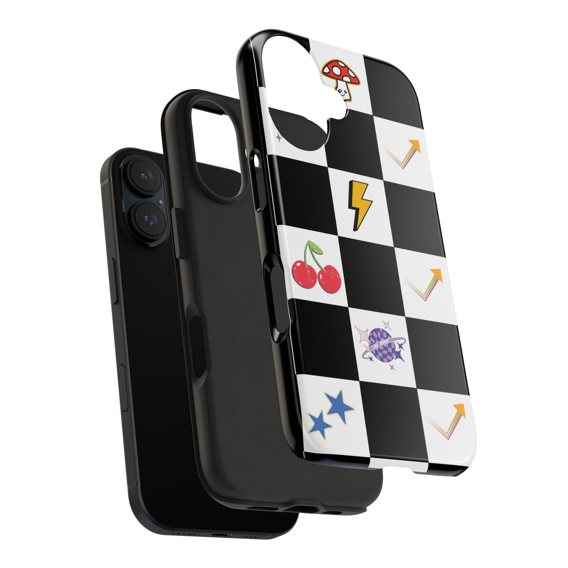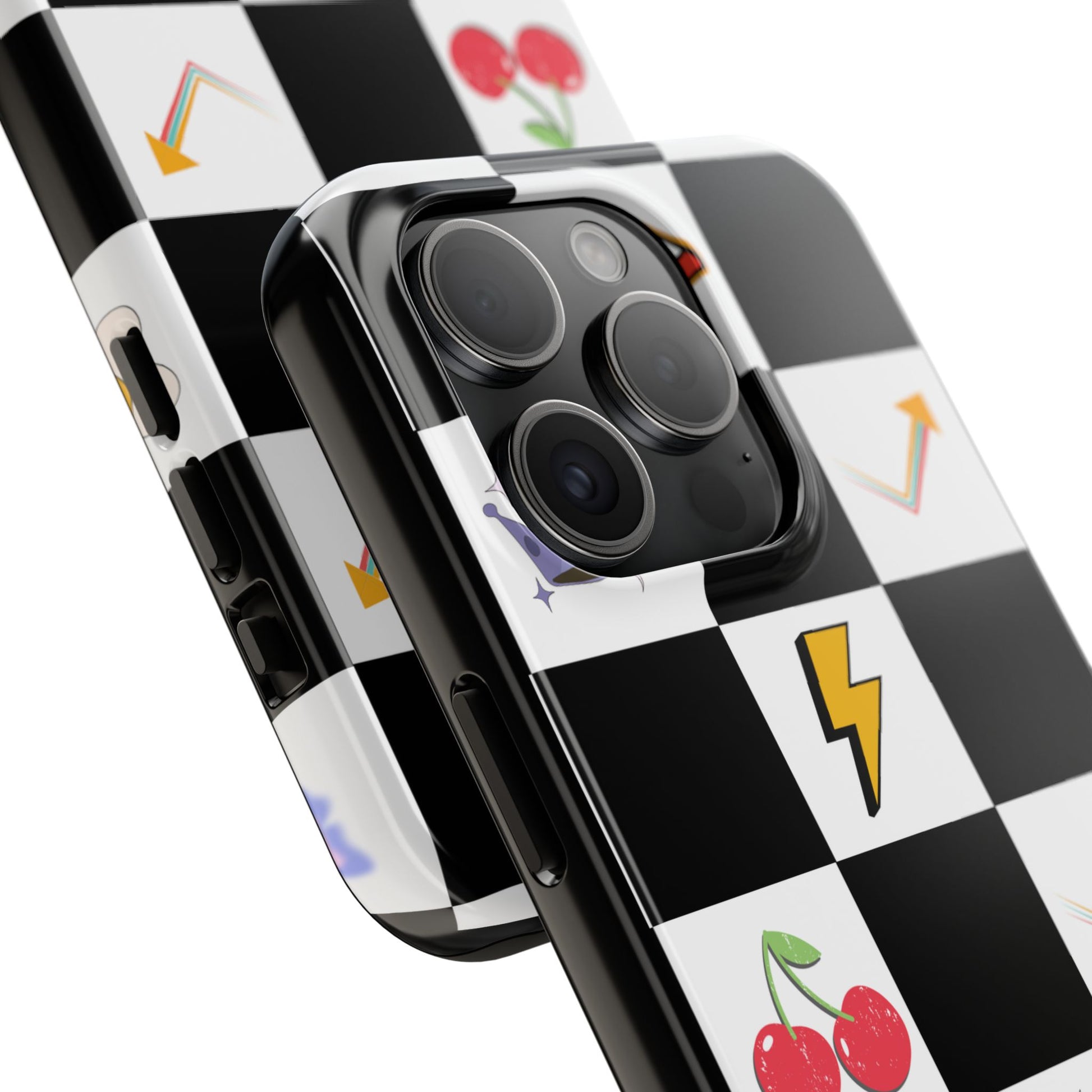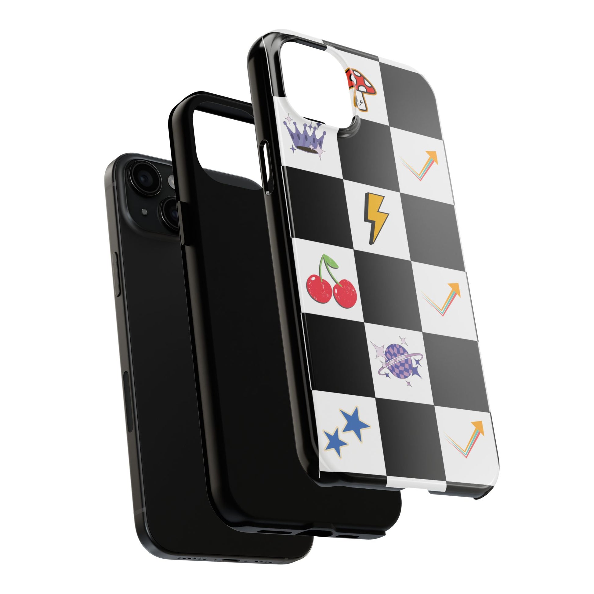 A striking, durable phone case that brings playful retro charm to everyday protection. The bold black-and-white checkerboard design is dotted with bright, whimsical icons — cherries, mushrooms, lightning bolts, stars and arrows — giving the case a lively, arcade-era vibe. Built with a tough polycarbonate shell and soft TPU liner, it absorbs shocks while the raised lay-flat bezel shields the screen from scratches. The glossy, UV-protected finish keeps colors vibrant outdoors, and the two-piece design makes it easy to snap on and off without sacrificing security. This case suits someone who likes nostalgic, graphic style and wants rugged, modern protection that still feels fun.