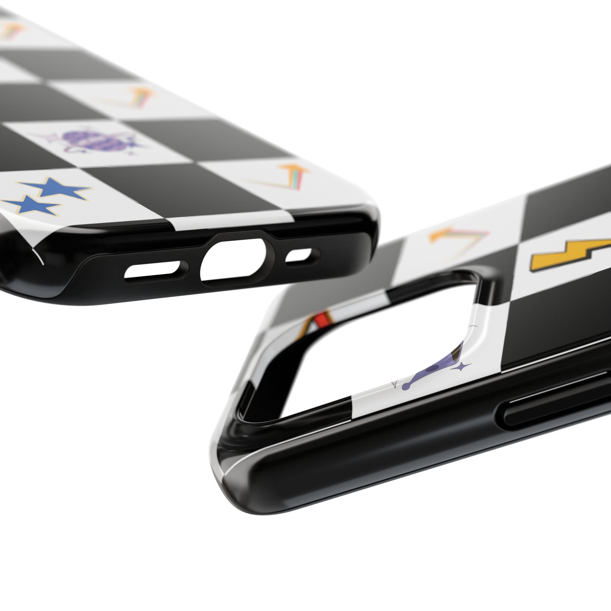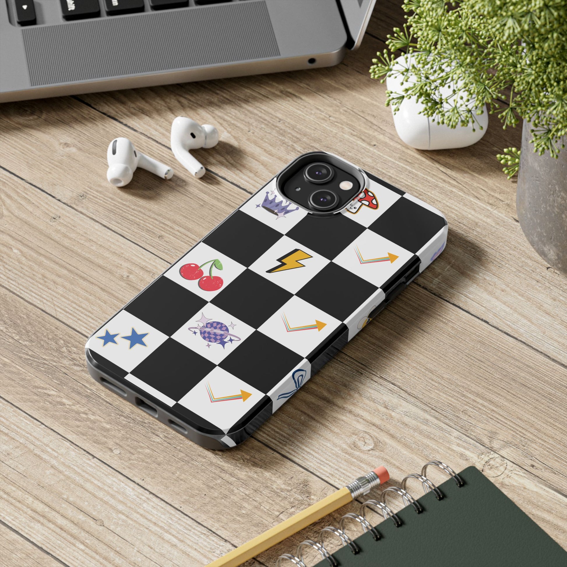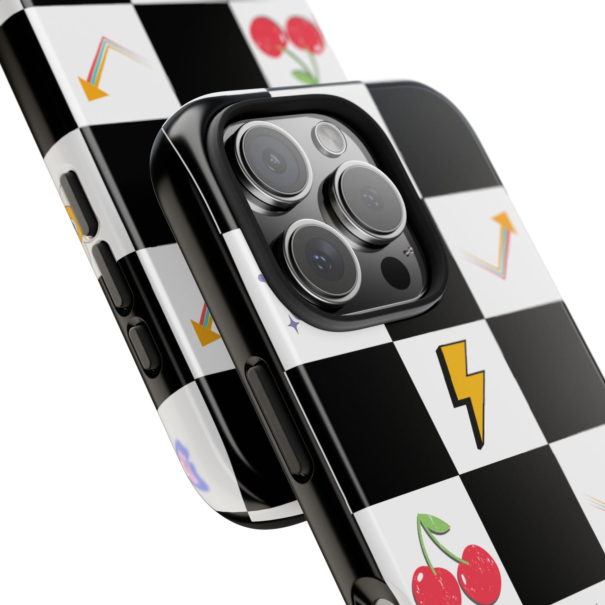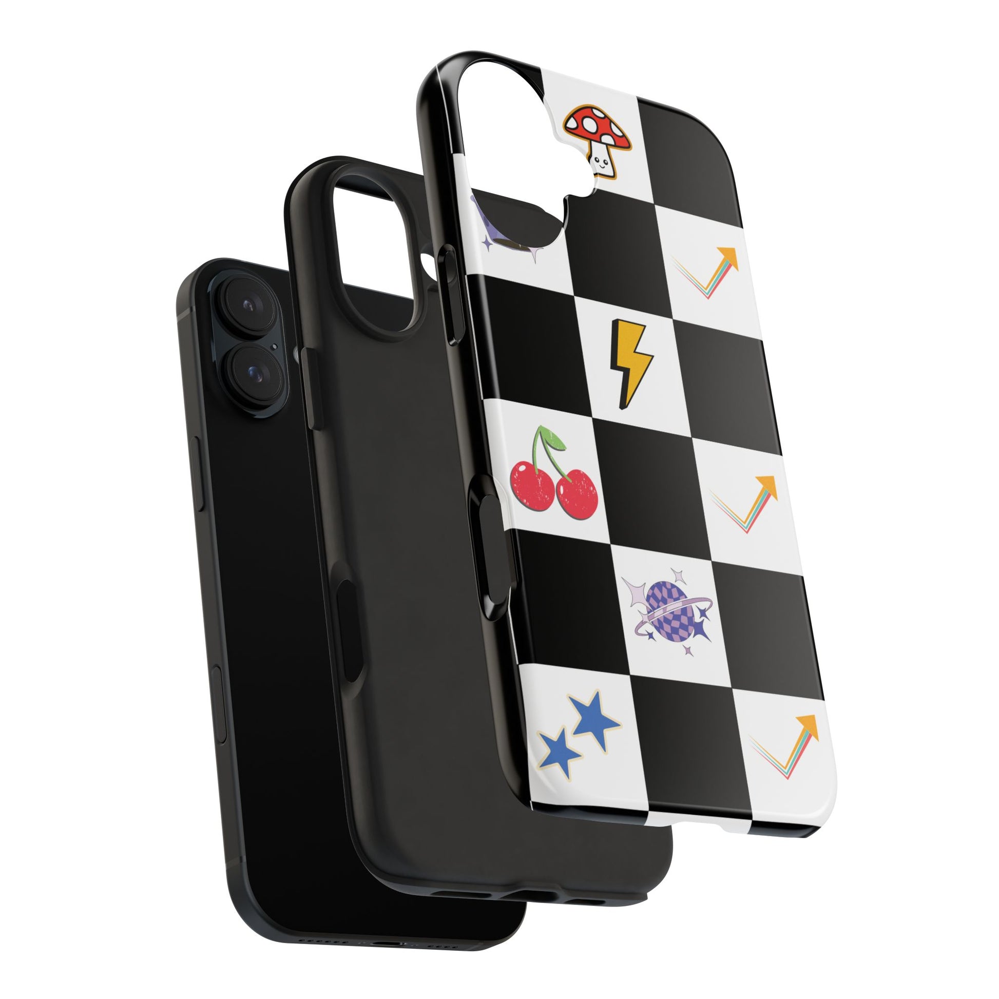 A striking, durable phone case that brings playful retro charm to everyday protection. The bold black-and-white checkerboard design is dotted with bright, whimsical icons — cherries, mushrooms, lightning bolts, stars and arrows — giving the case a lively, arcade-era vibe. Built with a tough polycarbonate shell and soft TPU liner, it absorbs shocks while the raised lay-flat bezel shields the screen from scratches. The glossy, UV-protected finish keeps colors vibrant outdoors, and the two-piece design makes it easy to snap on and off without sacrificing security. This case suits someone who likes nostalgic, graphic style and wants rugged, modern protection that still feels fun.